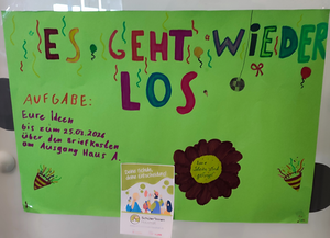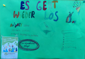 Im Schulhaus hängen selbstgemachte Plakate aus, die darauf hinweisen, dass noch bis zum kommenden Mittwoch, das ist der 25.03.26, Ideen abgegeben werden können.
