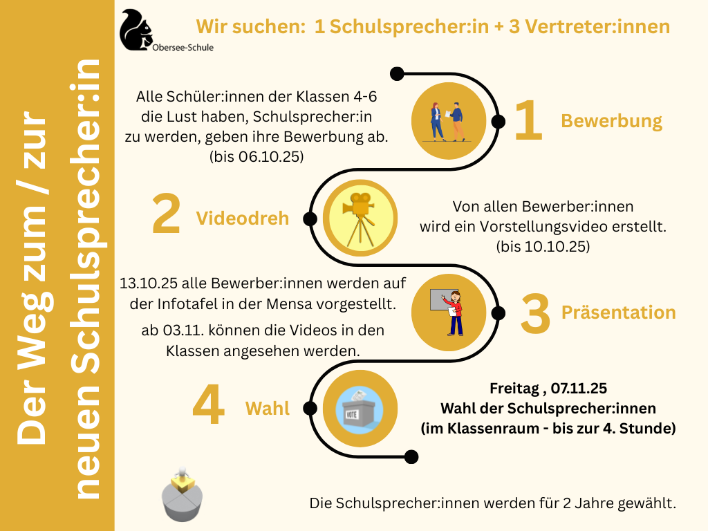 Zum Schuljahr 25/26 haben unsere Schulsprecherinnen die Obersee-Schule veralssen. Daher galt es im neuen Schuljahr, neue Schulsprecher:innen zu wählen.